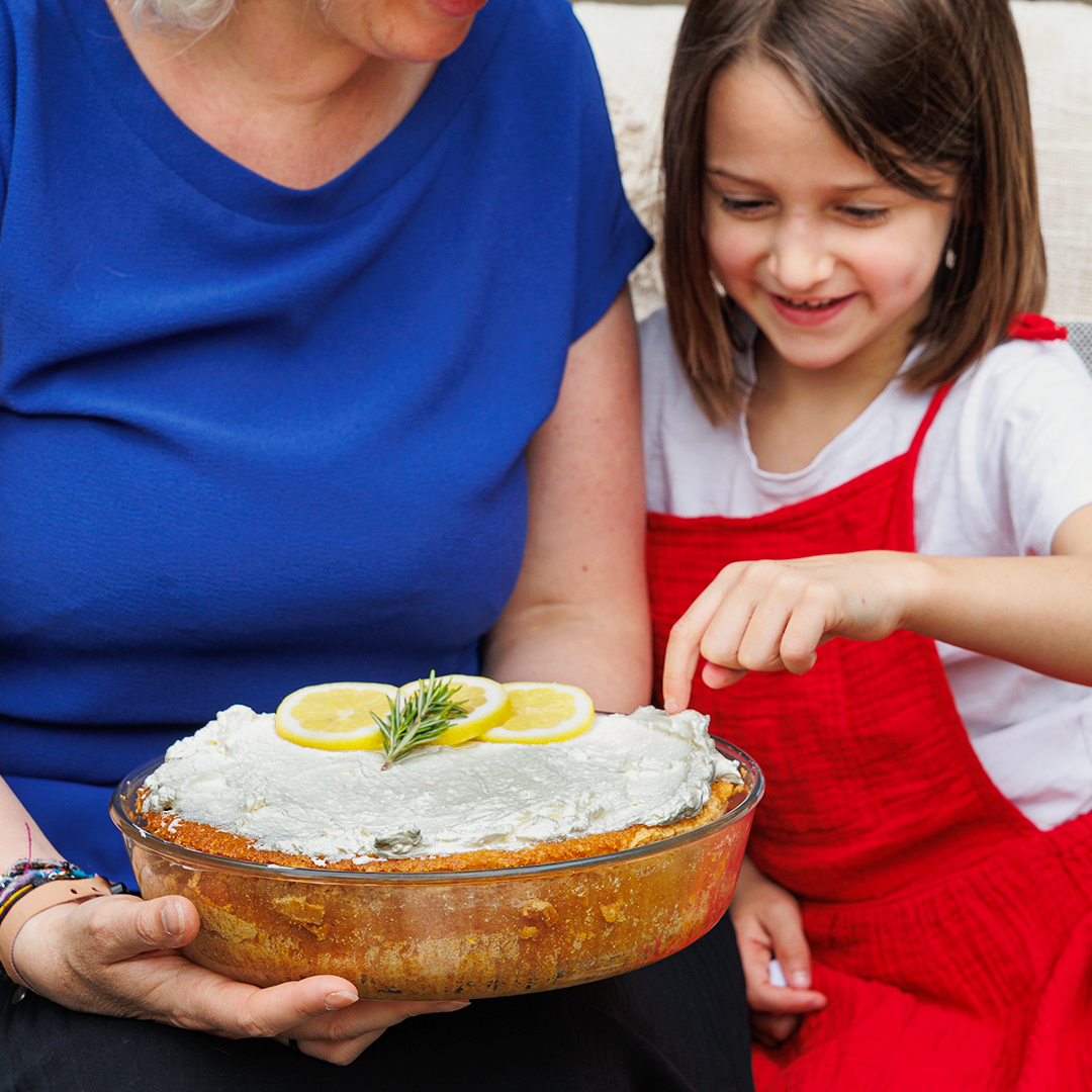 Réalisez une crème chantilly mascarpone pour accompagner le gâteau. Décorez d’un quartier de citron et d’un peu de romarin.