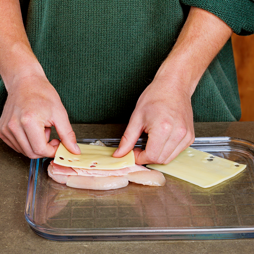Saler et poivrer. Déposer une tranche de jambon et une tranche de fromage Replier le filet de poulet