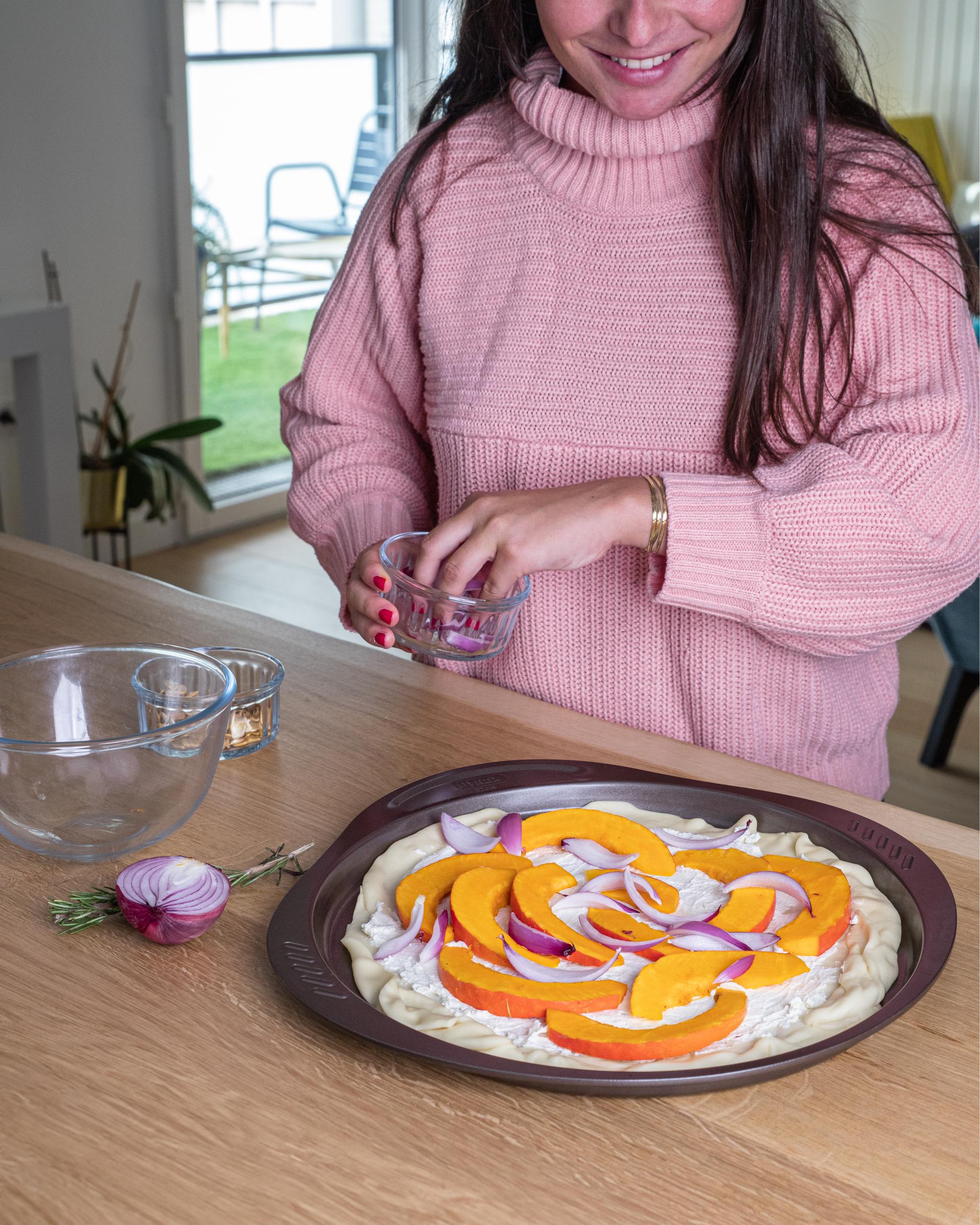 La douceur de la citrouille, la vivacité de l'oignon rouge, le crémeux du fromage frais, une pizza automnale irrésistible. Savourez!