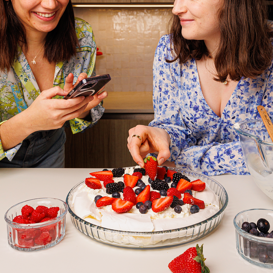 Déposez la chantilly sur la meringue et disposez les fruits sur le dessus
