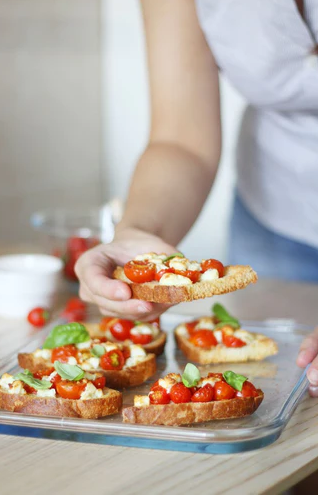Sortez les bruschettas du four, tartinez-les d'un peu de burrata et déposez dessus le mélange tomates/roquette.