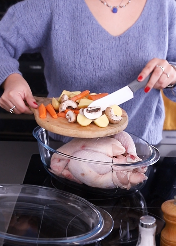 Ajoutez les légumes dans la cocotte. Ajoutez un peu d'huile. Fermez le couvercle et enfournez pendant 1 heure.