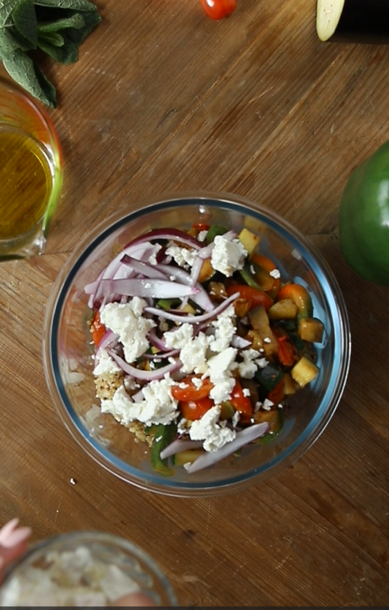 Mettez le quinoa dans un bol, ajoutez les légumes grillés et émiettez la feta. Assaisonnez avec du sel et du poivre. Ajoutez l'huile d'olive.