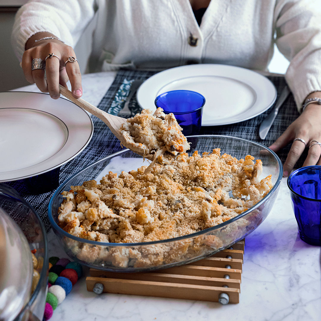 Placez la dinde au fond du plat et ajoutez la purée de pommes de terre par dessus.