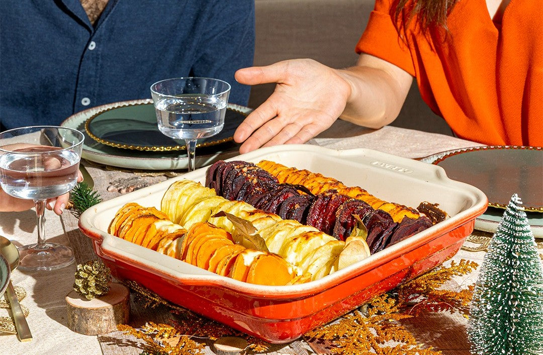 Peler les patates douces, les panais et les betteraves. Trancher les légumes en fines lamelles régulières à l’aide d’une mandoline ou d’un couteau bien aiguisé. Mettre chaque type de légume dans un saladier séparé.